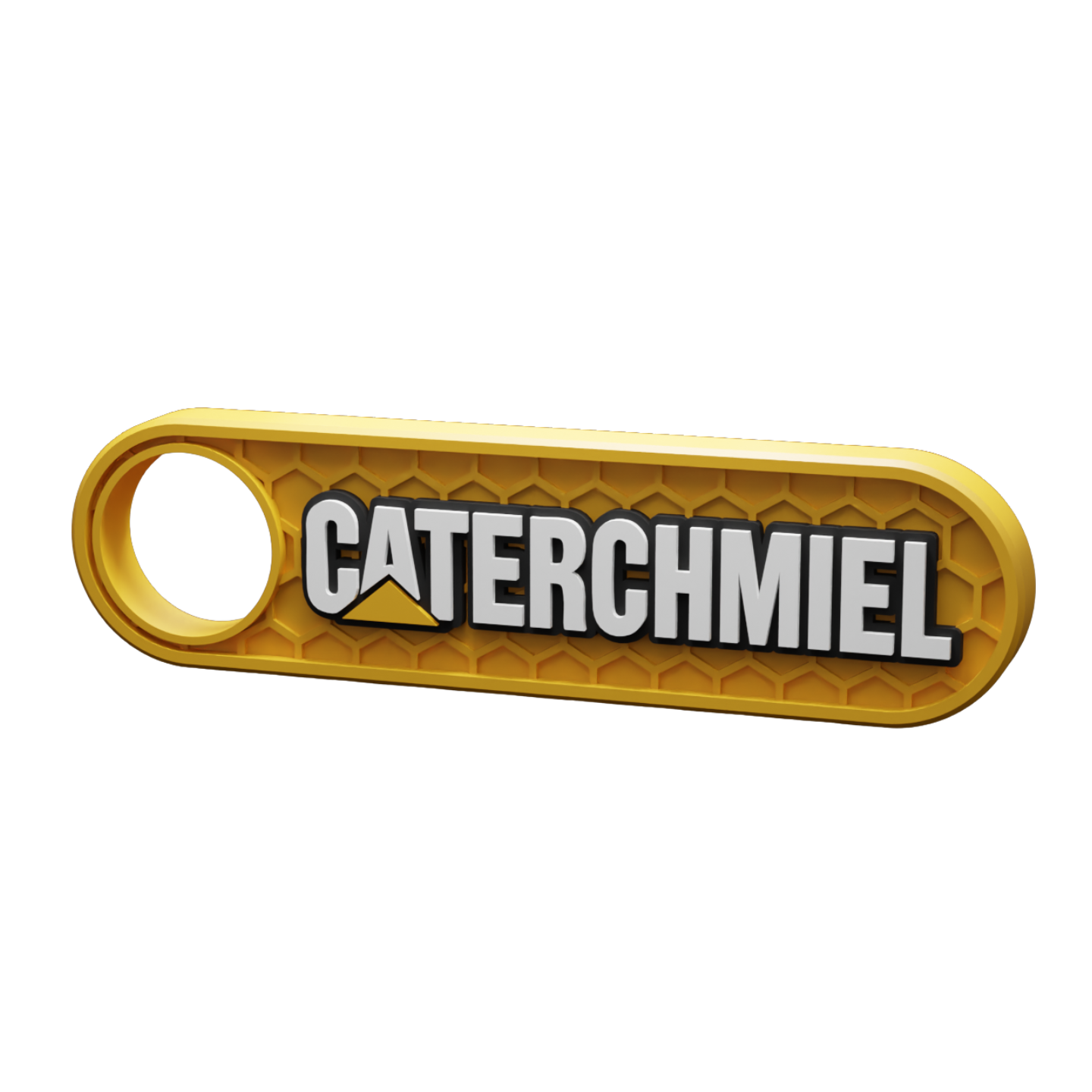 Front otwieracza zdobi napis CATERCHMIEL, osadzony na tle o strukturze plastra miodu, które nadaje całości nowoczesny i techniczny charakter. Intensywny żółty kolor nawiązuje do estetyki sprzętu budowlanego i warsztatowego, dzięki czemu gadżet wygląda jak element wyposażenia profesjonalnego warsztatu.