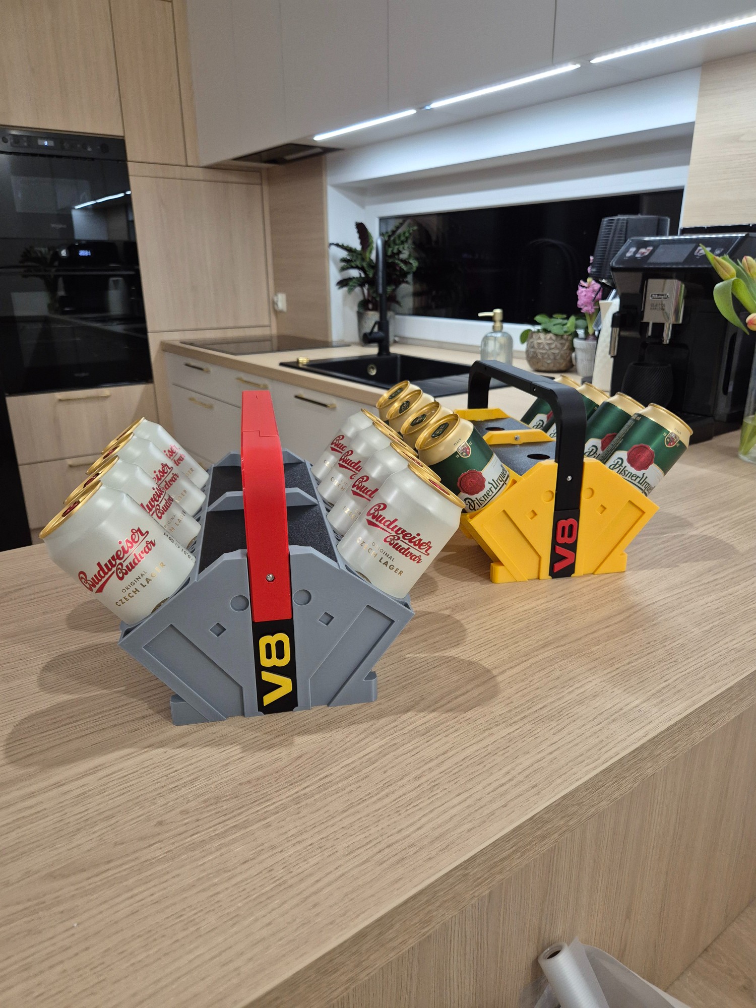 Skrzynka mieści 8 puszek o standardowej średnicy (do 71 mm). Stabilna konstrukcja zapewnia bezpieczne przenoszenie napojów, a ergonomiczny uchwyt pozwala wygodnie transportować pełne obciążenie. Otwory są precyzyjnie dopasowane, dzięki czemu puszki są dobrze osadzone i nie przemieszczają się podczas przenoszenia.